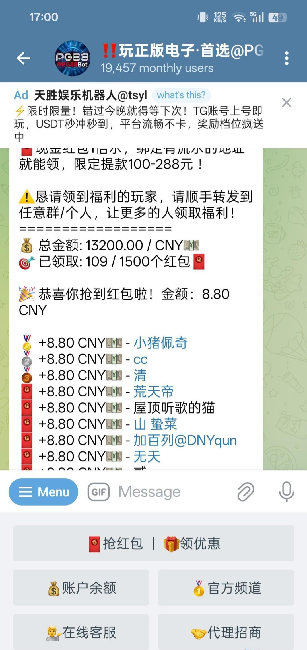 飞机关注机器人@pg88,1500个8.8红包